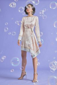 - A-line dress with front drape.