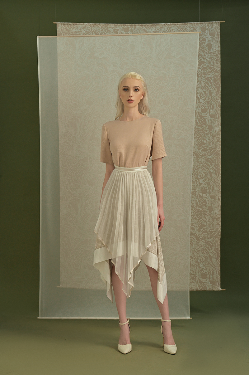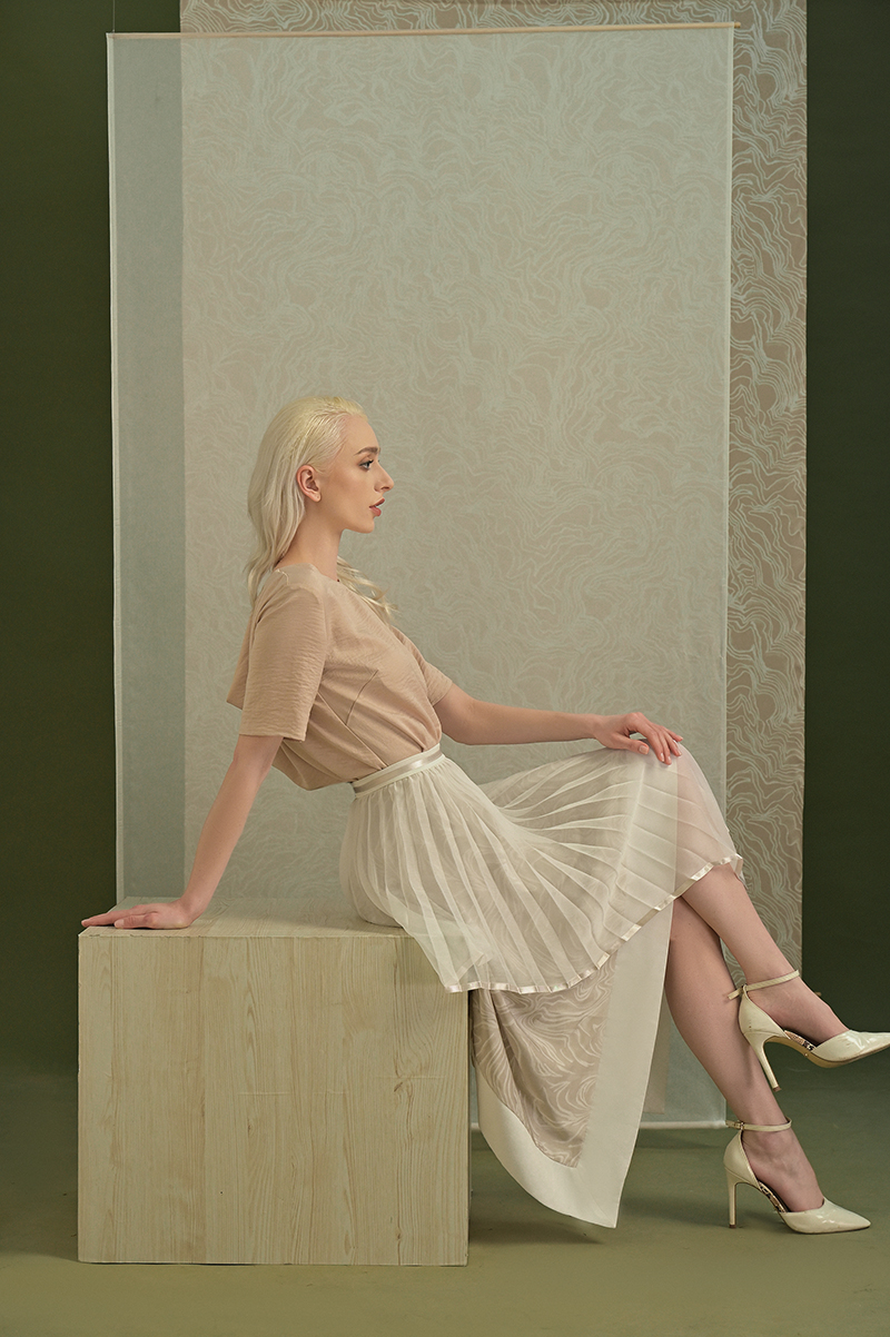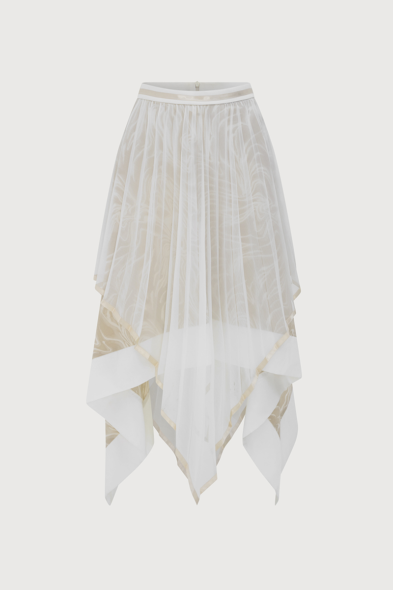 • 2 layers: chiffon with satin ribbon trimmings and marble printed satin