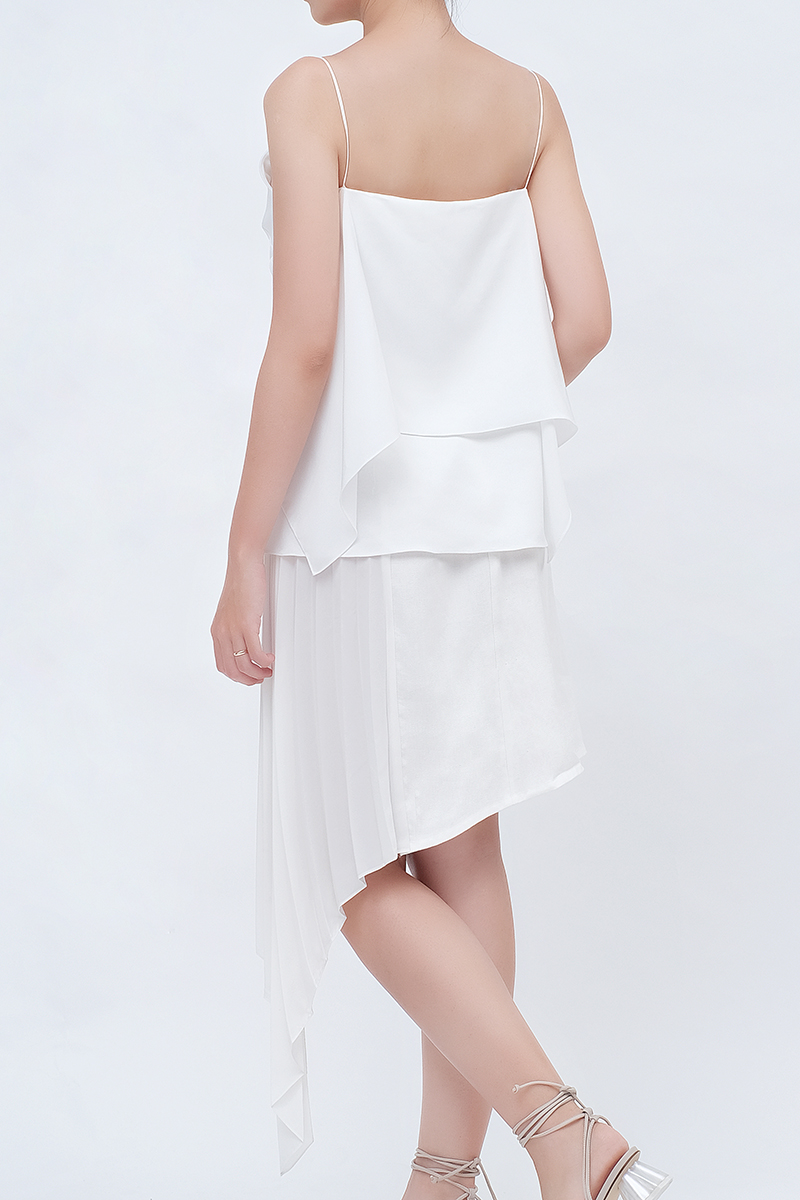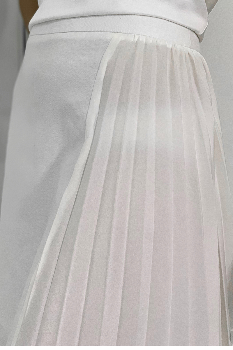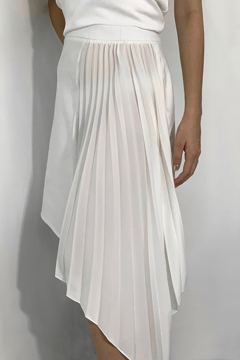 • Asymmetrical skirt pleated in accordion pattern